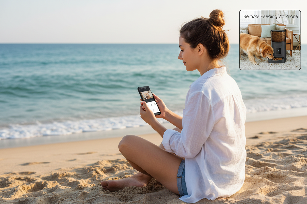 Whether you’re at the beach, in the office, or on the go, you can feed, watch, and talk to your pet straight from your phone — no missed meals, no stress.